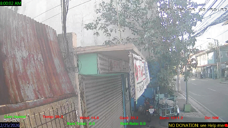 1 Rain season in the Philippines: June 1st to Oct 31st.   5 Estimated amount of water needed to replace the water used by plants and evaporation from the past week. (Negative numbers mean amount of water needed, positive numbers mean excess water is present).   6 Air Quality Index is provided by Luftdaten System esp8266 and is updated every 5 mins..   9 Solar Index represents either an absolute scale of solar energy (W/m²) using the station’s recorded maximum or a percentage of computed theoretical solar maximum using the station’s location and time of day. These indices differ most when the sun is low on the horizon. The current scale is shown, and will toggle if it or the icon is clicked.   10 Historical average only to day 25 of just the month of February for this station since 2016.   11 Historical average rain this season to day 25 of February for this station since 2016.