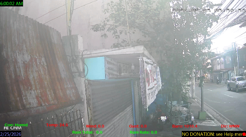 1 Rain season in the Philippines: June 1st to Oct 31st.   5 Estimated amount of water needed to replace the water used by plants and evaporation from the past week. (Negative numbers mean amount of water needed, positive numbers mean excess water is present).   6 Air Quality Index is provided by Luftdaten System esp8266 and is updated every 5 mins..   9 Solar Index represents either an absolute scale of solar energy (W/m²) using the station’s recorded maximum or a percentage of computed theoretical solar maximum using the station’s location and time of day. These indices differ most when the sun is low on the horizon. The current scale is shown, and will toggle if it or the icon is clicked.   10 Historical average only to day 25 of just the month of February for this station since 2016.   11 Historical average rain this season to day 25 of February for this station since 2016.