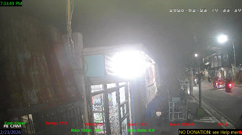 1 Rain season in the Philippines: June 1st to Oct 31st.   5 Estimated amount of water needed to replace the water used by plants and evaporation from the past week. (Negative numbers mean amount of water needed, positive numbers mean excess water is present).   6 Air Quality Index is provided by Luftdaten System esp8266 and is updated every 5 mins..   9 Solar Index represents either an absolute scale of solar energy (W/m²) using the station’s recorded maximum or a percentage of computed theoretical solar maximum using the station’s location and time of day. These indices differ most when the sun is low on the horizon. The current scale is shown, and will toggle if it or the icon is clicked.   10 Historical average only to day 23 of just the month of February for this station since 2016.   11 Historical average rain this season to day 23 of February for this station since 2016.