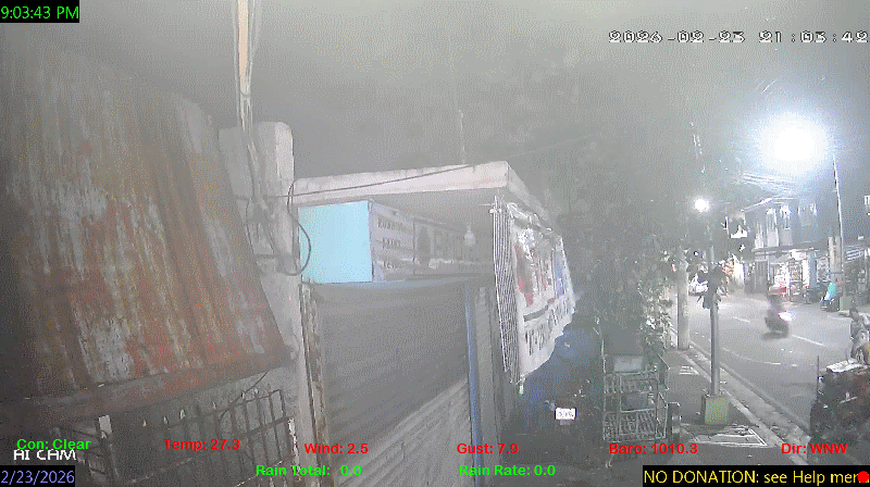 1 Rain season in the Philippines: June 1st to Oct 31st.   5 Estimated amount of water needed to replace the water used by plants and evaporation from the past week. (Negative numbers mean amount of water needed, positive numbers mean excess water is present).   6 Air Quality Index is provided by Luftdaten System esp8266 and is updated every 5 mins..   9 Solar Index represents either an absolute scale of solar energy (W/m²) using the station’s recorded maximum or a percentage of computed theoretical solar maximum using the station’s location and time of day. These indices differ most when the sun is low on the horizon. The current scale is shown, and will toggle if it or the icon is clicked.   10 Historical average only to day 23 of just the month of February for this station since 2016.   11 Historical average rain this season to day 23 of February for this station since 2016.
