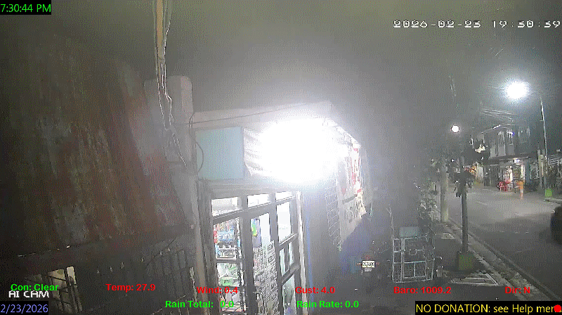 1 Rain season in the Philippines: June 1st to Oct 31st.   5 Estimated amount of water needed to replace the water used by plants and evaporation from the past week. (Negative numbers mean amount of water needed, positive numbers mean excess water is present).   6 Air Quality Index is provided by Luftdaten System esp8266 and is updated every 5 mins..   9 Solar Index represents either an absolute scale of solar energy (W/m²) using the station’s recorded maximum or a percentage of computed theoretical solar maximum using the station’s location and time of day. These indices differ most when the sun is low on the horizon. The current scale is shown, and will toggle if it or the icon is clicked.   10 Historical average only to day 23 of just the month of February for this station since 2016.   11 Historical average rain this season to day 23 of February for this station since 2016.