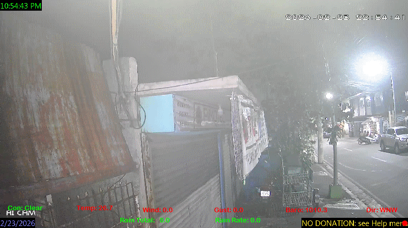 1 Rain season in the Philippines: June 1st to Oct 31st.   5 Estimated amount of water needed to replace the water used by plants and evaporation from the past week. (Negative numbers mean amount of water needed, positive numbers mean excess water is present).   6 Air Quality Index is provided by Luftdaten System esp8266 and is updated every 5 mins..   9 Solar Index represents either an absolute scale of solar energy (W/m²) using the station’s recorded maximum or a percentage of computed theoretical solar maximum using the station’s location and time of day. These indices differ most when the sun is low on the horizon. The current scale is shown, and will toggle if it or the icon is clicked.   10 Historical average only to day 23 of just the month of February for this station since 2016.   11 Historical average rain this season to day 23 of February for this station since 2016.