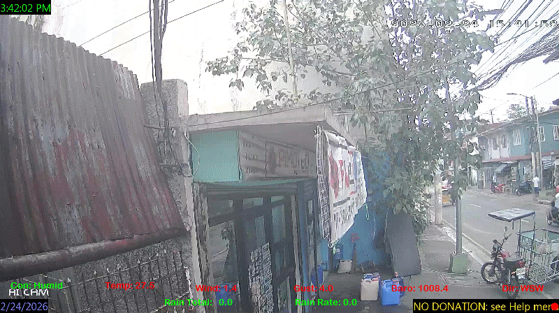 1 Rain season in the Philippines: June 1st to Oct 31st.   5 Estimated amount of water needed to replace the water used by plants and evaporation from the past week. (Negative numbers mean amount of water needed, positive numbers mean excess water is present).   6 Air Quality Index is provided by Luftdaten System esp8266 and is updated every 5 mins..   9 Solar Index represents either an absolute scale of solar energy (W/m²) using the station’s recorded maximum or a percentage of computed theoretical solar maximum using the station’s location and time of day. These indices differ most when the sun is low on the horizon. The current scale is shown, and will toggle if it or the icon is clicked.   10 Historical average only to day 24 of just the month of February for this station since 2016.   11 Historical average rain this season to day 24 of February for this station since 2016.