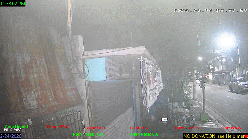 1 Rain season in the Philippines: June 1st to Oct 31st.   5 Estimated amount of water needed to replace the water used by plants and evaporation from the past week. (Negative numbers mean amount of water needed, positive numbers mean excess water is present).   6 Air Quality Index is provided by Luftdaten System esp8266 and is updated every 5 mins..   9 Solar Index represents either an absolute scale of solar energy (W/m²) using the station’s recorded maximum or a percentage of computed theoretical solar maximum using the station’s location and time of day. These indices differ most when the sun is low on the horizon. The current scale is shown, and will toggle if it or the icon is clicked.   10 Historical average only to day 24 of just the month of February for this station since 2016.   11 Historical average rain this season to day 24 of February for this station since 2016.