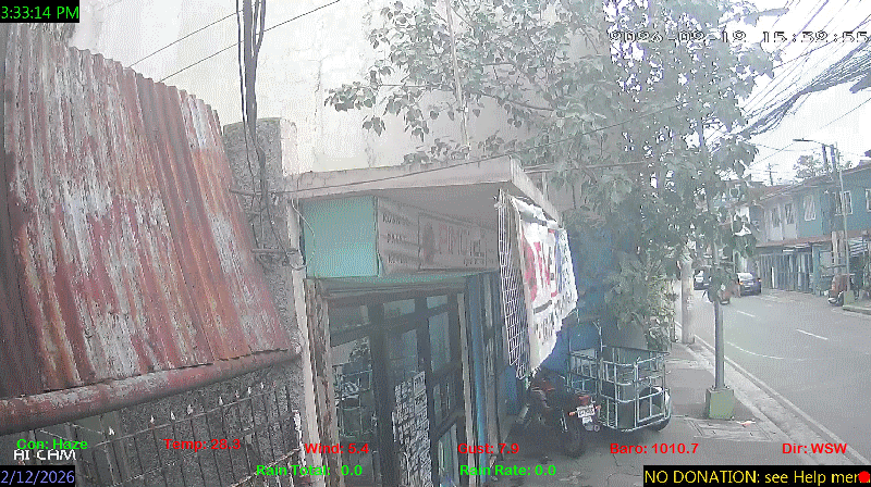 1 Rain season in the Philippines: June 1st to Oct 31st.   5 Estimated amount of water needed to replace the water used by plants and evaporation from the past week. (Negative numbers mean amount of water needed, positive numbers mean excess water is present).   6 Air Quality Index is provided by Luftdaten System esp8266 and is updated every 5 mins..   9 Solar Index represents either an absolute scale of solar energy (W/m²) using the station’s recorded maximum or a percentage of computed theoretical solar maximum using the station’s location and time of day. These indices differ most when the sun is low on the horizon. The current scale is shown, and will toggle if it or the icon is clicked.   10 Historical average only to day 12 of just the month of February for this station since 2016.   11 Historical average rain this season to day 12 of February for this station since 2016.