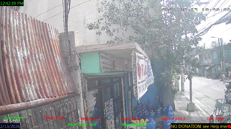 1 Rain season in the Philippines: June 1st to Oct 31st.   5 Estimated amount of water needed to replace the water used by plants and evaporation from the past week. (Negative numbers mean amount of water needed, positive numbers mean excess water is present).   6 Air Quality Index is provided by Luftdaten System esp8266 and is updated every 5 mins..   9 Solar Index represents either an absolute scale of solar energy (W/m²) using the station’s recorded maximum or a percentage of computed theoretical solar maximum using the station’s location and time of day. These indices differ most when the sun is low on the horizon. The current scale is shown, and will toggle if it or the icon is clicked.   10 Historical average only to day 13 of just the month of February for this station since 2016.   11 Historical average rain this season to day 13 of February for this station since 2016.
