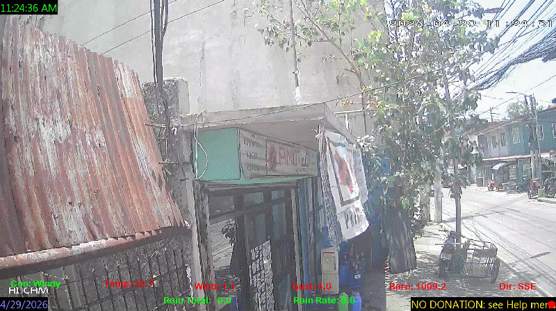 1 Rain season in the Philippines: June 1st to Oct 31st.   5 Estimated amount of water needed to replace the water used by plants and evaporation from the past week. (Negative numbers mean amount of water needed, positive numbers mean excess water is present).   6 Air Quality Index is provided by Luftdaten System esp8266 and is updated every 5 mins..   9 Solar Index represents either an absolute scale of solar energy (W/m²) using the station’s recorded maximum or a percentage of computed theoretical solar maximum using the station’s location and time of day. These indices differ most when the sun is low on the horizon. The current scale is shown, and will toggle if it or the icon is clicked.   10 Historical average only to day 29 of just the month of April for this station since 2017.   11 Historical average rain this season to day 29 of April for this station since 2017.