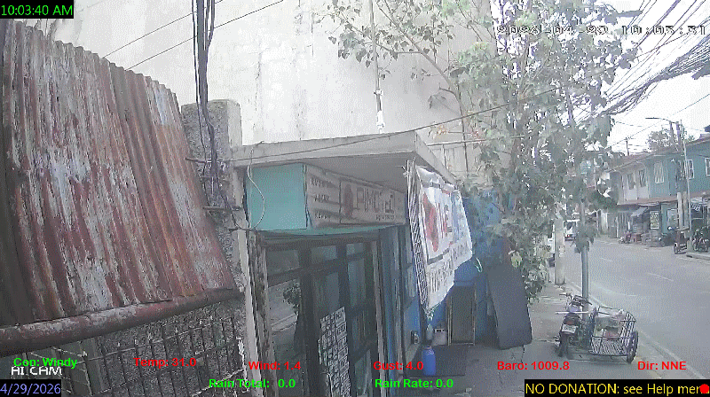 1 Rain season in the Philippines: June 1st to Oct 31st.   5 Estimated amount of water needed to replace the water used by plants and evaporation from the past week. (Negative numbers mean amount of water needed, positive numbers mean excess water is present).   6 Air Quality Index is provided by Luftdaten System esp8266 and is updated every 5 mins..   9 Solar Index represents either an absolute scale of solar energy (W/m²) using the station’s recorded maximum or a percentage of computed theoretical solar maximum using the station’s location and time of day. These indices differ most when the sun is low on the horizon. The current scale is shown, and will toggle if it or the icon is clicked.   10 Historical average only to day 29 of just the month of April for this station since 2017.   11 Historical average rain this season to day 29 of April for this station since 2017.