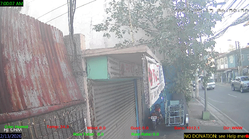 1 Rain season in the Philippines: June 1st to Oct 31st.   5 Estimated amount of water needed to replace the water used by plants and evaporation from the past week. (Negative numbers mean amount of water needed, positive numbers mean excess water is present).   6 Air Quality Index is provided by Luftdaten System esp8266 and is updated every 5 mins..   9 Solar Index represents either an absolute scale of solar energy (W/m²) using the station’s recorded maximum or a percentage of computed theoretical solar maximum using the station’s location and time of day. These indices differ most when the sun is low on the horizon. The current scale is shown, and will toggle if it or the icon is clicked.   10 Historical average only to day 13 of just the month of February for this station since 2016.   11 Historical average rain this season to day 13 of February for this station since 2016.