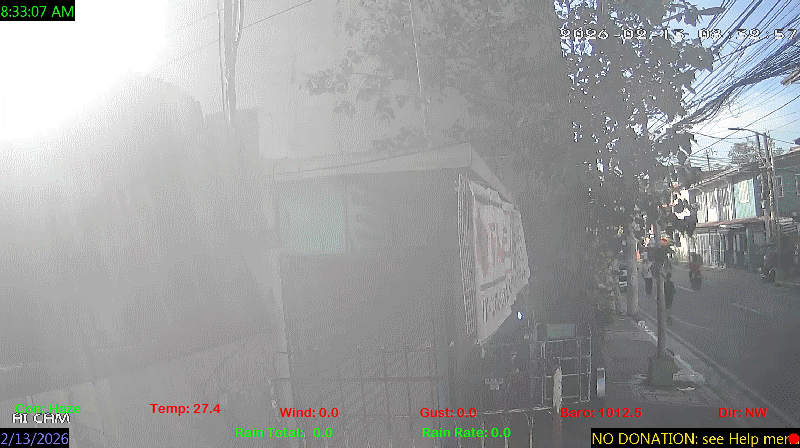 1 Rain season in the Philippines: June 1st to Oct 31st.   5 Estimated amount of water needed to replace the water used by plants and evaporation from the past week. (Negative numbers mean amount of water needed, positive numbers mean excess water is present).   6 Air Quality Index is provided by Luftdaten System esp8266 and is updated every 5 mins..   9 Solar Index represents either an absolute scale of solar energy (W/m²) using the station’s recorded maximum or a percentage of computed theoretical solar maximum using the station’s location and time of day. These indices differ most when the sun is low on the horizon. The current scale is shown, and will toggle if it or the icon is clicked.   10 Historical average only to day 13 of just the month of February for this station since 2016.   11 Historical average rain this season to day 13 of February for this station since 2016.