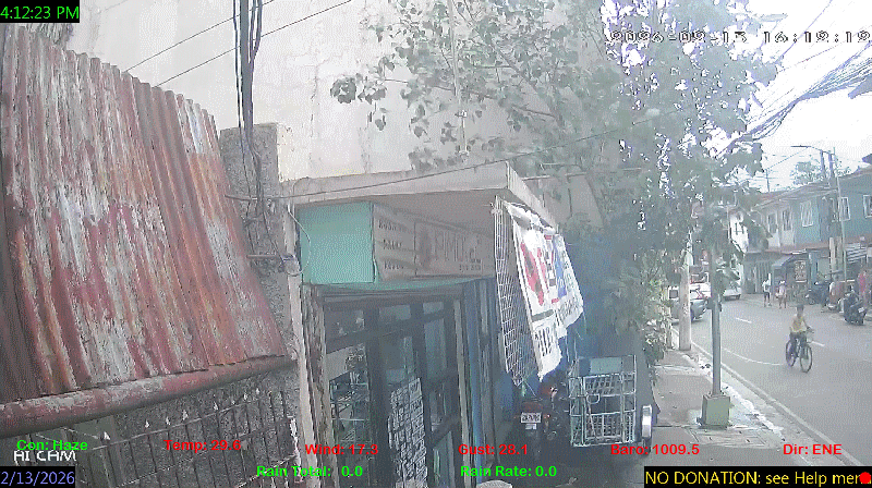 1 Rain season in the Philippines: June 1st to Oct 31st.   5 Estimated amount of water needed to replace the water used by plants and evaporation from the past week. (Negative numbers mean amount of water needed, positive numbers mean excess water is present).   6 Air Quality Index is provided by Luftdaten System esp8266 and is updated every 5 mins..   9 Solar Index represents either an absolute scale of solar energy (W/m²) using the station’s recorded maximum or a percentage of computed theoretical solar maximum using the station’s location and time of day. These indices differ most when the sun is low on the horizon. The current scale is shown, and will toggle if it or the icon is clicked.   10 Historical average only to day 13 of just the month of February for this station since 2016.   11 Historical average rain this season to day 13 of February for this station since 2016.