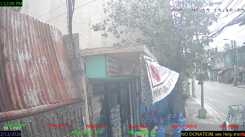 1 Rain season in the Philippines: June 1st to Oct 31st.   5 Estimated amount of water needed to replace the water used by plants and evaporation from the past week. (Negative numbers mean amount of water needed, positive numbers mean excess water is present).   6 Air Quality Index is provided by Luftdaten System esp8266 and is updated every 5 mins..   9 Solar Index represents either an absolute scale of solar energy (W/m²) using the station’s recorded maximum or a percentage of computed theoretical solar maximum using the station’s location and time of day. These indices differ most when the sun is low on the horizon. The current scale is shown, and will toggle if it or the icon is clicked.   10 Historical average only to day 13 of just the month of February for this station since 2016.   11 Historical average rain this season to day 13 of February for this station since 2016.