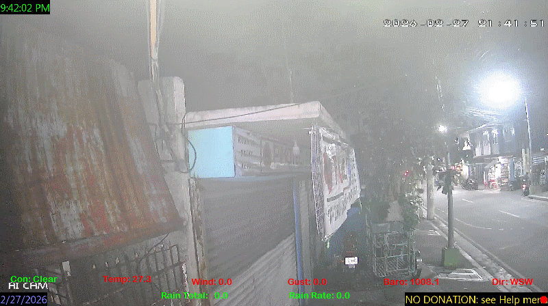 1 Rain season in the Philippines: June 1st to Oct 31st.   5 Estimated amount of water needed to replace the water used by plants and evaporation from the past week. (Negative numbers mean amount of water needed, positive numbers mean excess water is present).   6 Air Quality Index is provided by Luftdaten System esp8266 and is updated every 5 mins..   9 Solar Index represents either an absolute scale of solar energy (W/m²) using the station’s recorded maximum or a percentage of computed theoretical solar maximum using the station’s location and time of day. These indices differ most when the sun is low on the horizon. The current scale is shown, and will toggle if it or the icon is clicked.   10 Historical average only to day 27 of just the month of February for this station since 2016.   11 Historical average rain this season to day 27 of February for this station since 2016.