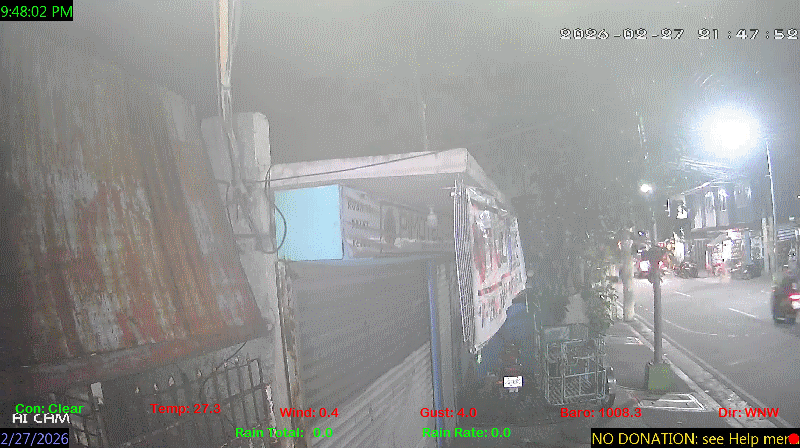 1 Rain season in the Philippines: June 1st to Oct 31st.   5 Estimated amount of water needed to replace the water used by plants and evaporation from the past week. (Negative numbers mean amount of water needed, positive numbers mean excess water is present).   6 Air Quality Index is provided by Luftdaten System esp8266 and is updated every 5 mins..   9 Solar Index represents either an absolute scale of solar energy (W/m²) using the station’s recorded maximum or a percentage of computed theoretical solar maximum using the station’s location and time of day. These indices differ most when the sun is low on the horizon. The current scale is shown, and will toggle if it or the icon is clicked.   10 Historical average only to day 27 of just the month of February for this station since 2016.   11 Historical average rain this season to day 27 of February for this station since 2016.