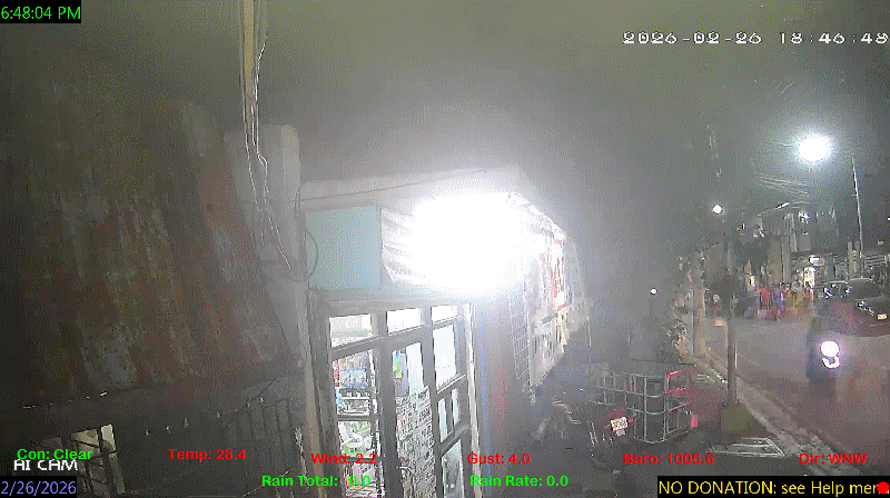 1 Rain season in the Philippines: June 1st to Oct 31st.   5 Estimated amount of water needed to replace the water used by plants and evaporation from the past week. (Negative numbers mean amount of water needed, positive numbers mean excess water is present).   6 Air Quality Index is provided by Luftdaten System esp8266 and is updated every 5 mins..   9 Solar Index represents either an absolute scale of solar energy (W/m²) using the station’s recorded maximum or a percentage of computed theoretical solar maximum using the station’s location and time of day. These indices differ most when the sun is low on the horizon. The current scale is shown, and will toggle if it or the icon is clicked.   10 Historical average only to day 26 of just the month of February for this station since 2016.   11 Historical average rain this season to day 26 of February for this station since 2016.