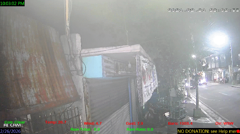 1 Rain season in the Philippines: June 1st to Oct 31st.   5 Estimated amount of water needed to replace the water used by plants and evaporation from the past week. (Negative numbers mean amount of water needed, positive numbers mean excess water is present).   6 Air Quality Index is provided by Luftdaten System esp8266 and is updated every 5 mins..   9 Solar Index represents either an absolute scale of solar energy (W/m²) using the station’s recorded maximum or a percentage of computed theoretical solar maximum using the station’s location and time of day. These indices differ most when the sun is low on the horizon. The current scale is shown, and will toggle if it or the icon is clicked.   10 Historical average only to day 26 of just the month of February for this station since 2016.   11 Historical average rain this season to day 26 of February for this station since 2016.