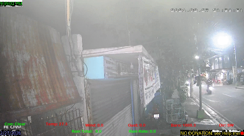 1 Rain season in the Philippines: June 1st to Oct 31st.   5 Estimated amount of water needed to replace the water used by plants and evaporation from the past week. (Negative numbers mean amount of water needed, positive numbers mean excess water is present).   6 Air Quality Index is provided by Luftdaten System esp8266 and is updated every 5 mins..   9 Solar Index represents either an absolute scale of solar energy (W/m²) using the station’s recorded maximum or a percentage of computed theoretical solar maximum using the station’s location and time of day. These indices differ most when the sun is low on the horizon. The current scale is shown, and will toggle if it or the icon is clicked.   10 Historical average only to day 27 of just the month of February for this station since 2016.   11 Historical average rain this season to day 27 of February for this station since 2016.