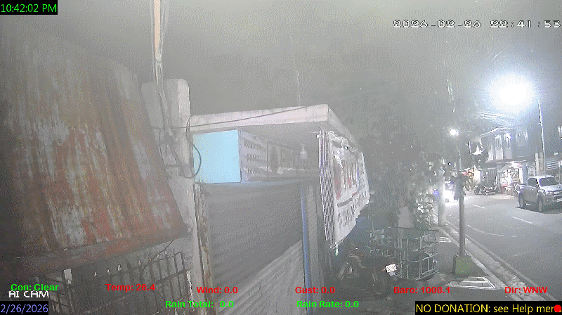 1 Rain season in the Philippines: June 1st to Oct 31st.   5 Estimated amount of water needed to replace the water used by plants and evaporation from the past week. (Negative numbers mean amount of water needed, positive numbers mean excess water is present).   6 Air Quality Index is provided by Luftdaten System esp8266 and is updated every 5 mins..   9 Solar Index represents either an absolute scale of solar energy (W/m²) using the station’s recorded maximum or a percentage of computed theoretical solar maximum using the station’s location and time of day. These indices differ most when the sun is low on the horizon. The current scale is shown, and will toggle if it or the icon is clicked.   10 Historical average only to day 26 of just the month of February for this station since 2016.   11 Historical average rain this season to day 26 of February for this station since 2016.