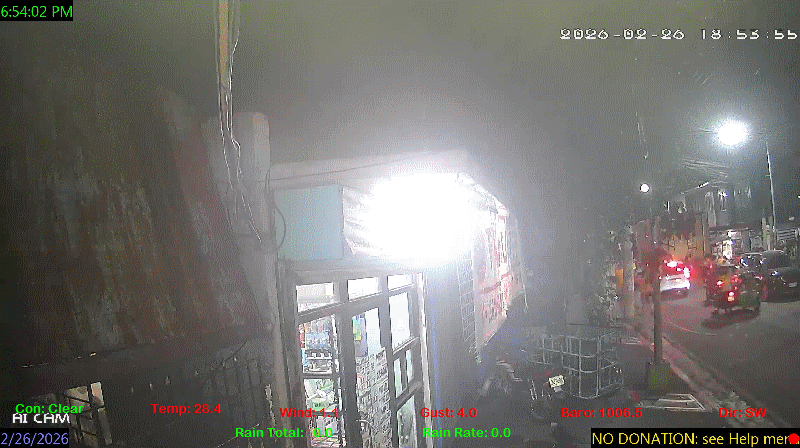 1 Rain season in the Philippines: June 1st to Oct 31st.   5 Estimated amount of water needed to replace the water used by plants and evaporation from the past week. (Negative numbers mean amount of water needed, positive numbers mean excess water is present).   6 Air Quality Index is provided by Luftdaten System esp8266 and is updated every 5 mins..   9 Solar Index represents either an absolute scale of solar energy (W/m²) using the station’s recorded maximum or a percentage of computed theoretical solar maximum using the station’s location and time of day. These indices differ most when the sun is low on the horizon. The current scale is shown, and will toggle if it or the icon is clicked.   10 Historical average only to day 26 of just the month of February for this station since 2016.   11 Historical average rain this season to day 26 of February for this station since 2016.