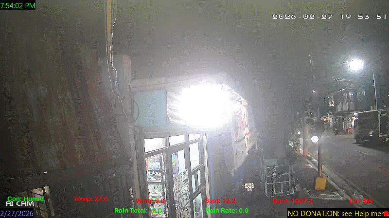 1 Rain season in the Philippines: June 1st to Oct 31st.   5 Estimated amount of water needed to replace the water used by plants and evaporation from the past week. (Negative numbers mean amount of water needed, positive numbers mean excess water is present).   6 Air Quality Index is provided by Luftdaten System esp8266 and is updated every 5 mins..   9 Solar Index represents either an absolute scale of solar energy (W/m²) using the station’s recorded maximum or a percentage of computed theoretical solar maximum using the station’s location and time of day. These indices differ most when the sun is low on the horizon. The current scale is shown, and will toggle if it or the icon is clicked.   10 Historical average only to day 27 of just the month of February for this station since 2016.   11 Historical average rain this season to day 27 of February for this station since 2016.