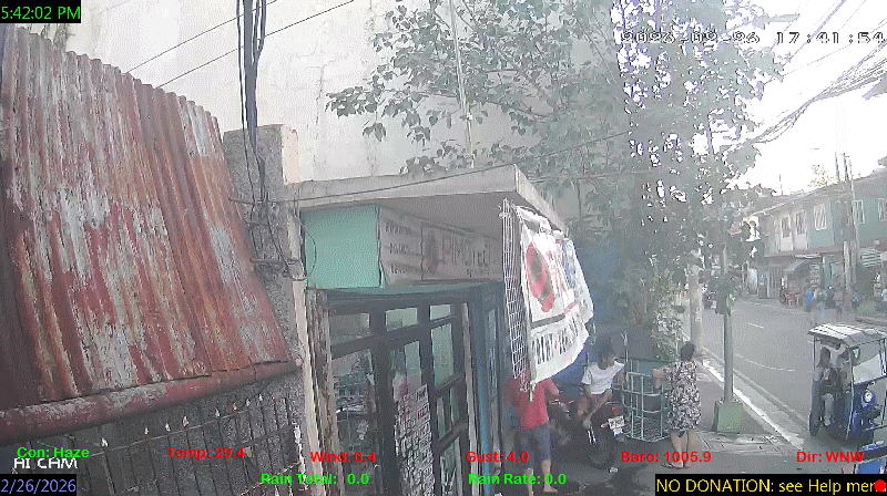 1 Rain season in the Philippines: June 1st to Oct 31st.   5 Estimated amount of water needed to replace the water used by plants and evaporation from the past week. (Negative numbers mean amount of water needed, positive numbers mean excess water is present).   6 Air Quality Index is provided by Luftdaten System esp8266 and is updated every 5 mins..   9 Solar Index represents either an absolute scale of solar energy (W/m²) using the station’s recorded maximum or a percentage of computed theoretical solar maximum using the station’s location and time of day. These indices differ most when the sun is low on the horizon. The current scale is shown, and will toggle if it or the icon is clicked.   10 Historical average only to day 26 of just the month of February for this station since 2016.   11 Historical average rain this season to day 26 of February for this station since 2016.